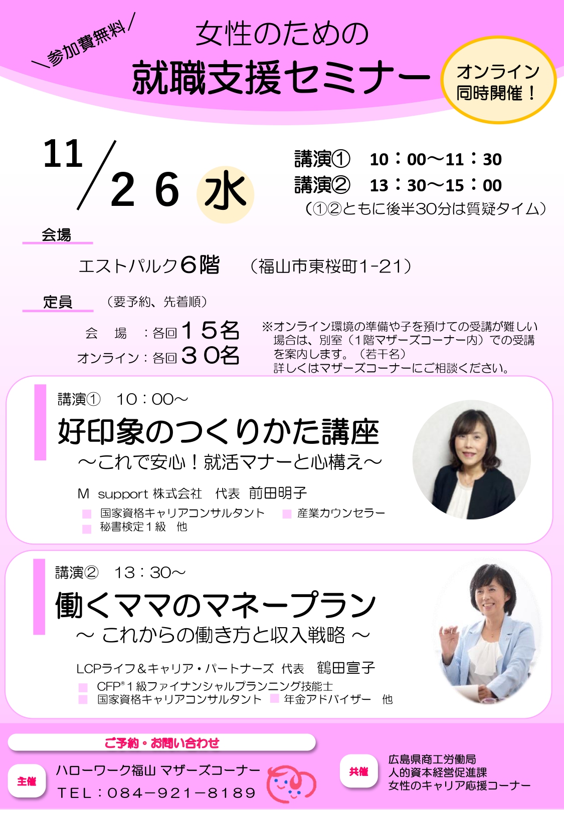 事前申し込み要です、予約受付は、ハローワーク福山マザーズコーナーへ、お電話または窓口まで!