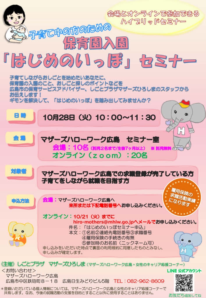 💻オンライン参加:10/21(火)までにマザーズハローワーク広島(hiro-mothers@mhlw.go.jp)へメールでお申込みください。
