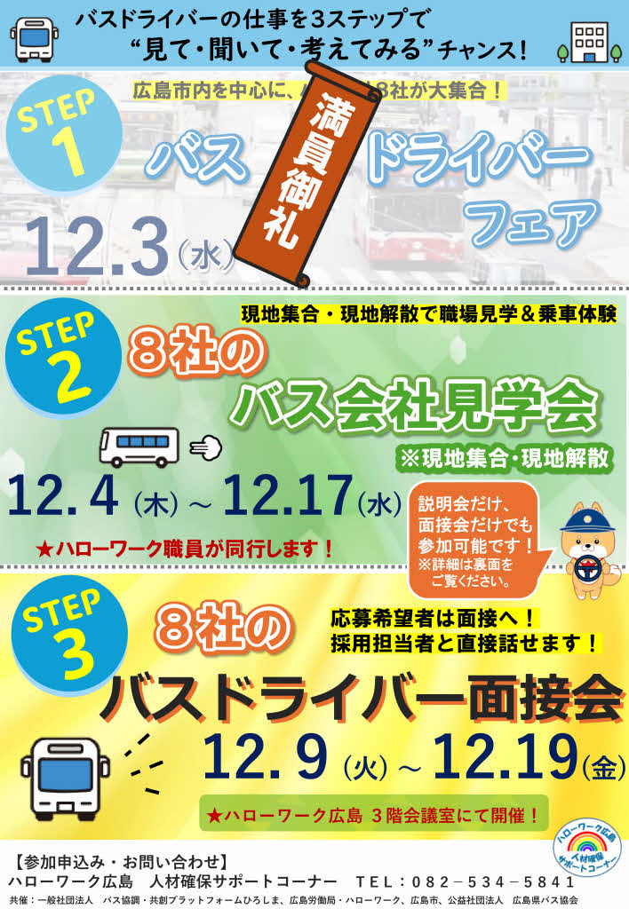 共催:一般社団法人 バス協調・共創プラットフォームひろしま、広島労働局・ハローワーク、広島市、公益社団法人 広島県バス協会