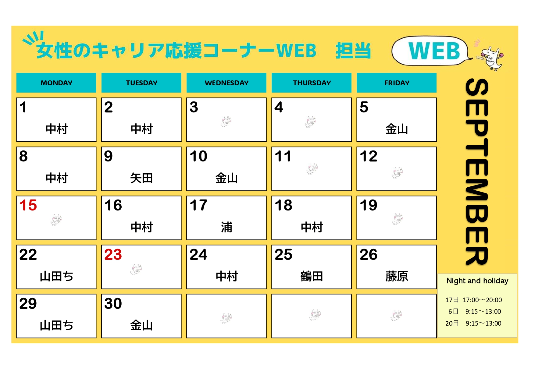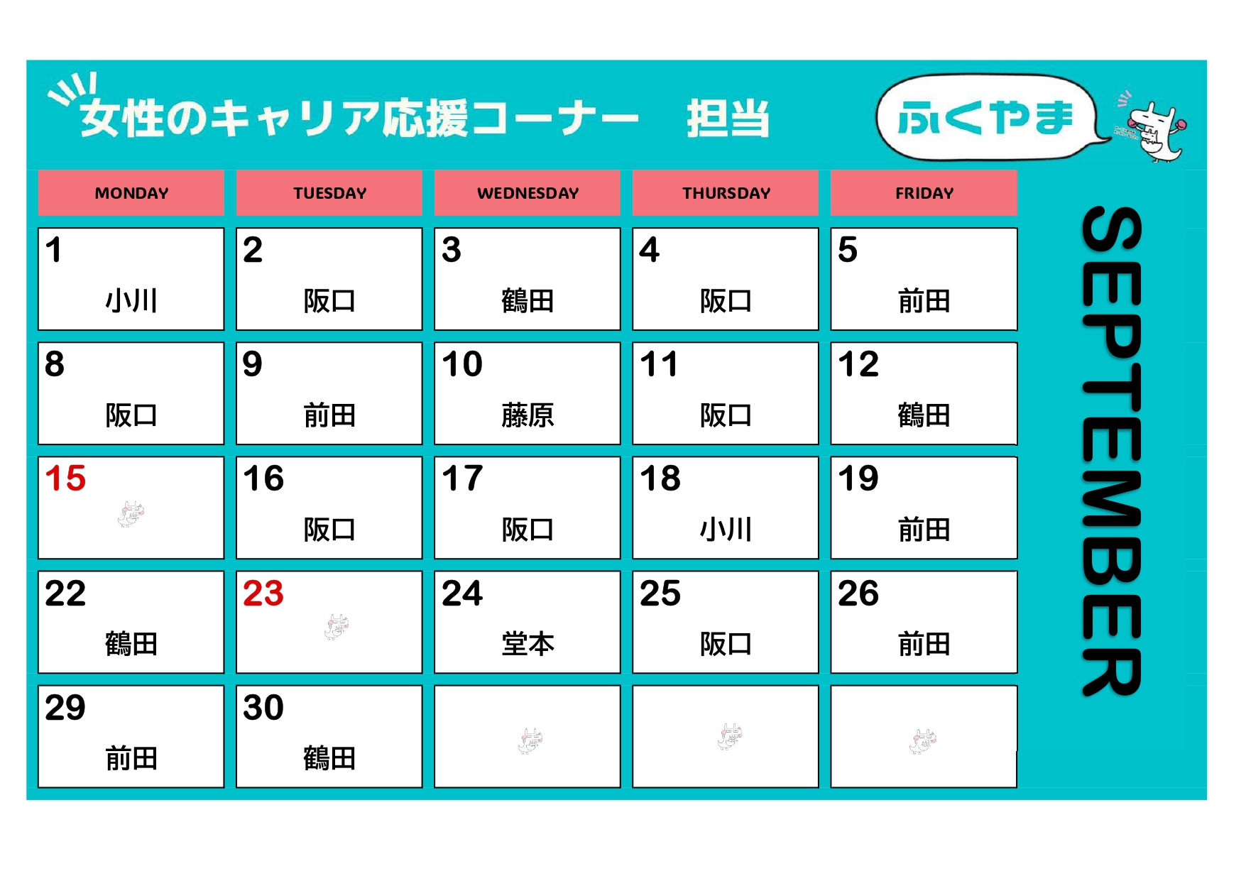 お知らせ【更新しました!】9月担当相談員カレンダー