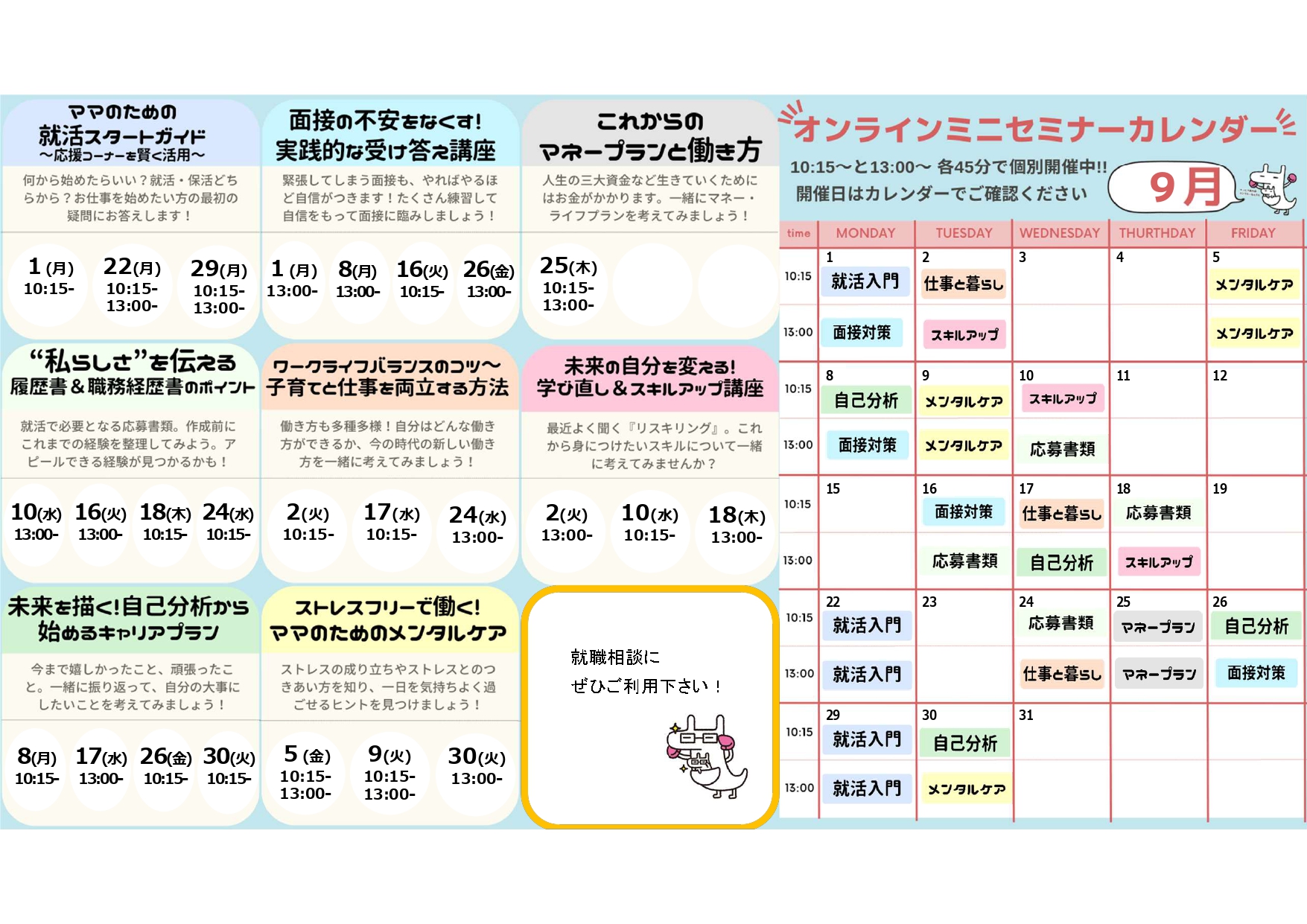 2025.8.29 お知らせ 9月【個別】オンラインミニセミナー 個別テーマを設定したオンラインミニセミナーも通常通り開催します。 (開催時間は10:15~,13:00~の2枠で開催中) 各テーマの開催日はカレンダーをご確認いただき、気になるテーマがありましたら お気軽にご予約くださいね!