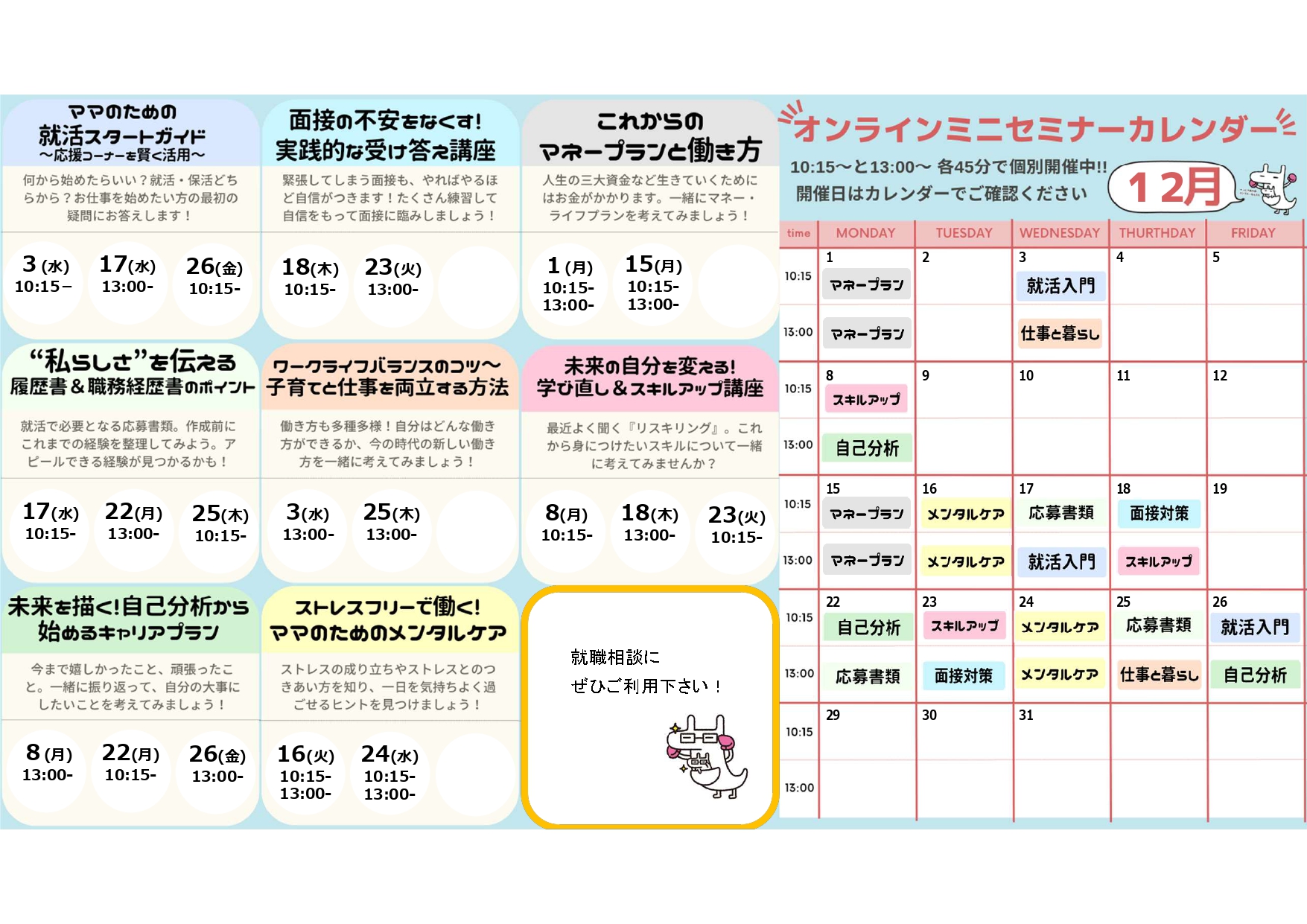 2025.11.26 お知らせ 12月【個別】オンラインミニセミナー 個別テーマを設定したオンラインミニセミナーも通常通り開催します。 (開催時間は10:15~,13:00~の2枠で開催中) 各テーマの開催日はカレンダーをご確認いただき、気になるテーマがありましたら お気軽にご予約くださいね!