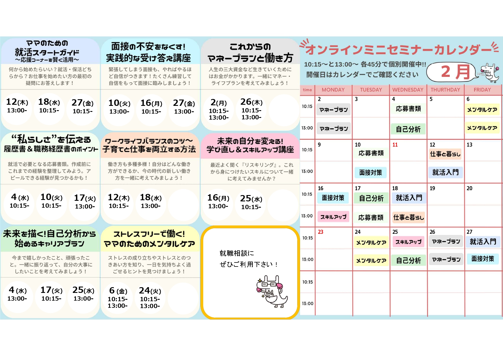 2026.1.26 お知らせ 2月【個別】オンラインミニセミナー 個別テーマを設定したオンラインミニセミナーも通常通り開催します。 (開催時間は10:15~,13:00~の2枠で開催中) 各テーマの開催日はカレンダーをご確認いただき、気になるテーマがありましたら お気軽にご予約くださいね!